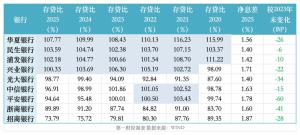 关键词: 2026-04-04 13:59:07  第一财经 自2015年起,存贷比不再作为国内监管对银行流动性风险管理的硬性指标。然而,银行业息差持续承压,行业竞争逻辑逐渐从规模扩张转向降本增效,存贷比偏高可能带来的风险压力正引起更多关注。截至2025年末,华夏银行、民生银行、浦发银行和兴业银行的存贷比均在100%以上,并且连续多年处于高位。相比之下,国有四大行存贷比最高为91%左右,股份行中招商银行存贷比仅为73.79%。尽管存贷比对流动性风险的指示意义已经有限,但在低息差时代,负债端低成本存款越来越向结算行集中,资产端也更考验银行投资赚钱的平滑能力,存贷比的观察意义进一步上升。WIND数据显示,截至2025年末,已经披露年报的22家上市银行中,共有10家存贷比超过90%,华夏银行、民生银行、浦发银行和兴业银行继续以超过100%的存贷比居于行业前列。随着贷款增速整体回落,去年多数银行存贷比有所下行。但上述4家股份行的存贷比已连续多年居于1倍以上高位,其中兴业银行维持时间最短,也有5年时间;一直领先的华夏银行,2021年末存贷比一度超过116%。光大银行近年来存贷比也一路攀升,从不足90%升至去年末的98.77%。中信银行和平安银行存贷比在2021年至2023年期间一直高居100%以上,最近两年逐步回落,去年末分别为96.91%和94.64%。